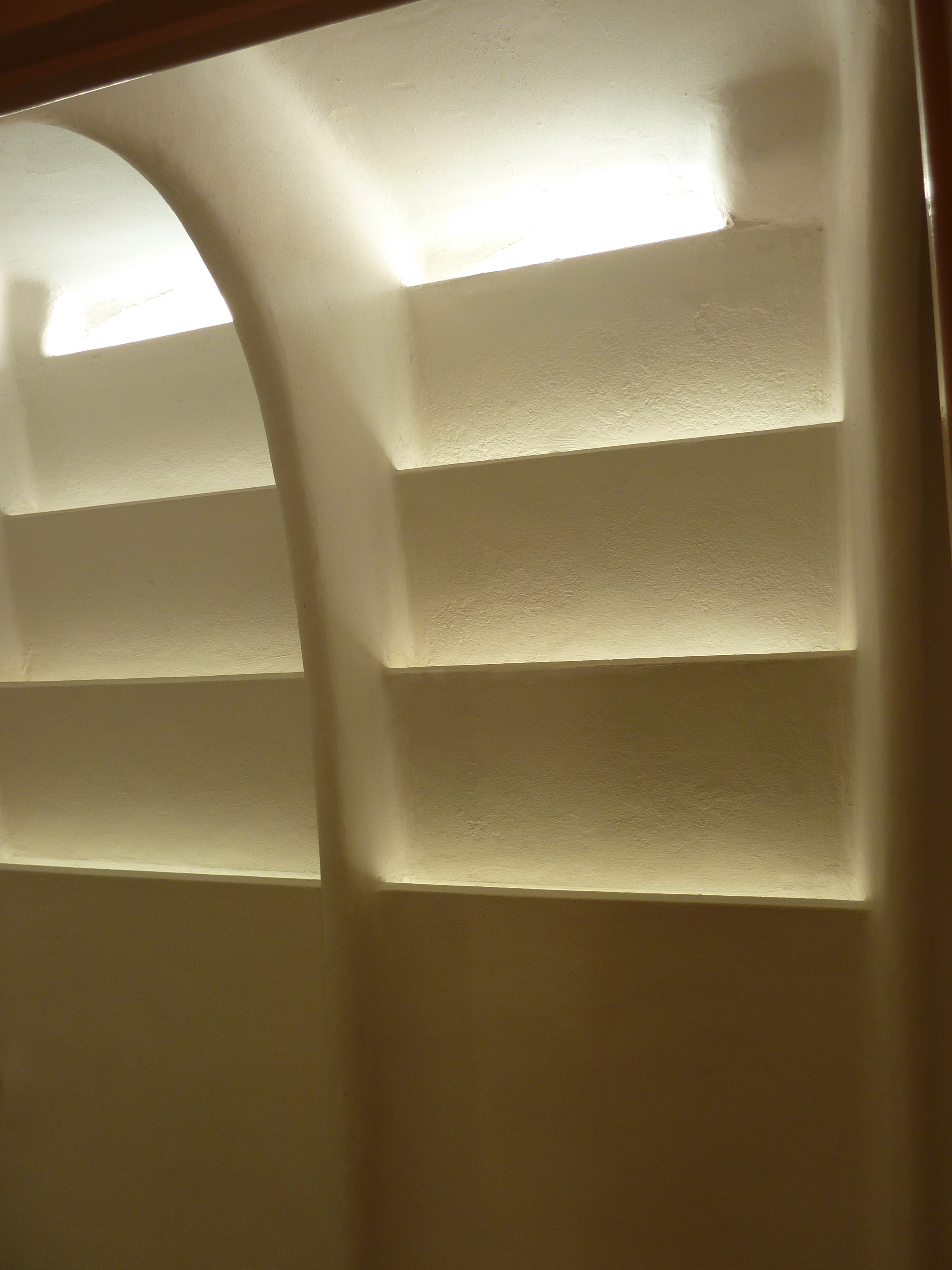 His obsession with lighting and air ventilation creates even small spaces that feel open and inviting. The slates in the walls create a flow of air throughout the house and shaped so no water will enter when it rains. There is a light well that runs down the middle of the house to let natural light into all the rooms. The tiles at the bottom are lighter and gradually become darker at they reach the top because the light tends to diffuse the color.
